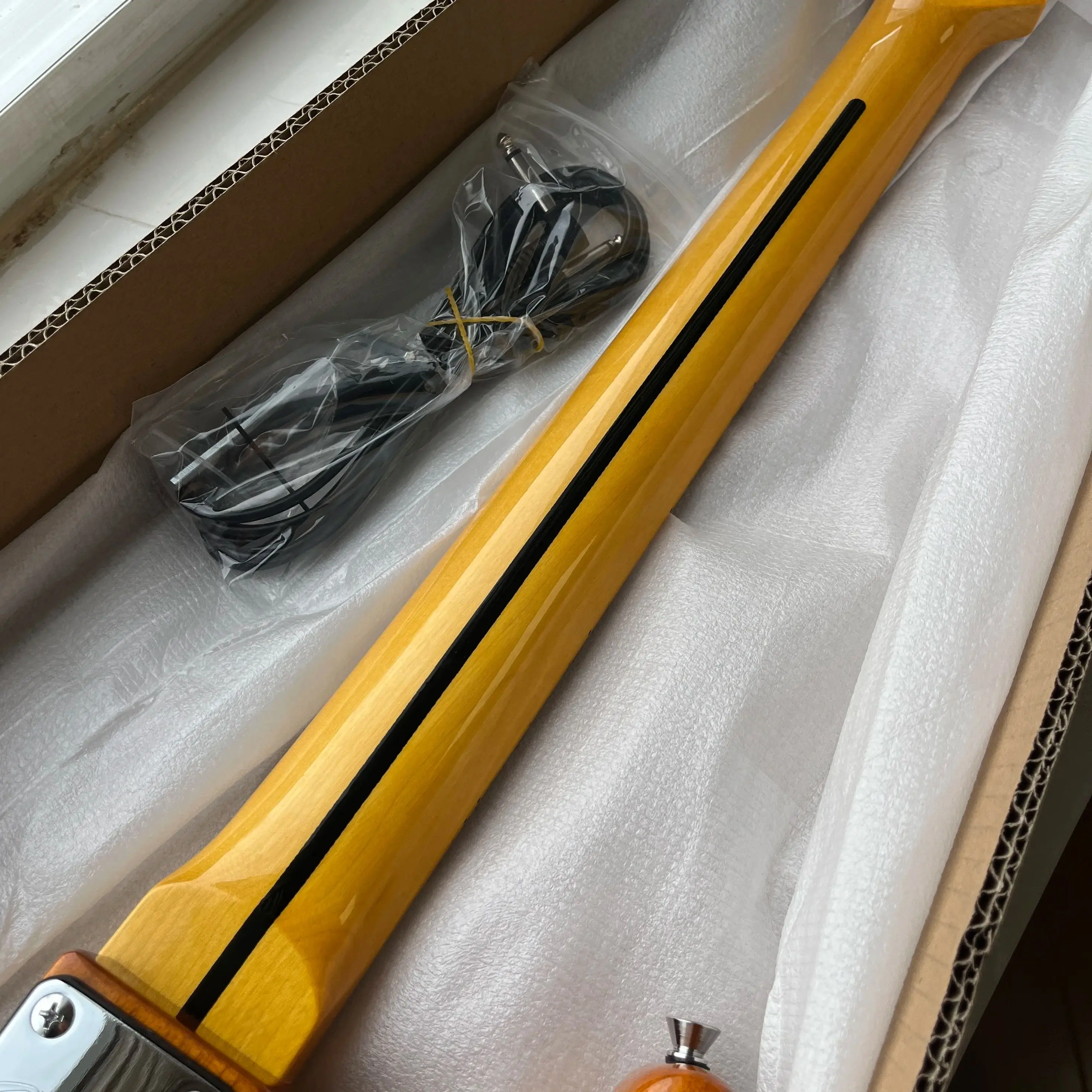Customized wooden-colored electric guitar with maple fretboard. Durable material, beautiful sound. Free shipping.