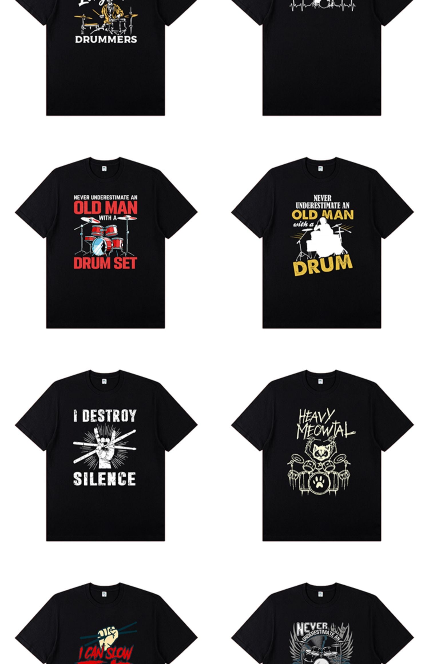 Turn heads with the Drum Pattern Short-Sleeved T-shirt, displaying a vibrant image of a cat playing drums paired with the witty "HEAVY MEOWTAL" phrase. This black tee blends relaxed comfort with a distinctive style, ideal for musicians eager to express their bold and lively character.