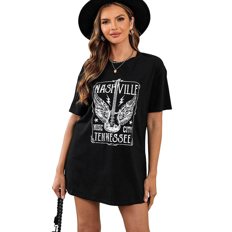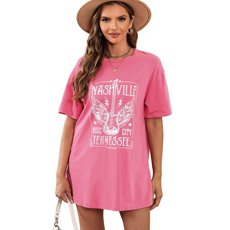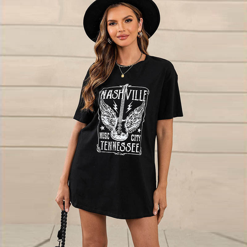 Summer New T-shirt Personalized Guitar Printed Pullover Round Neck